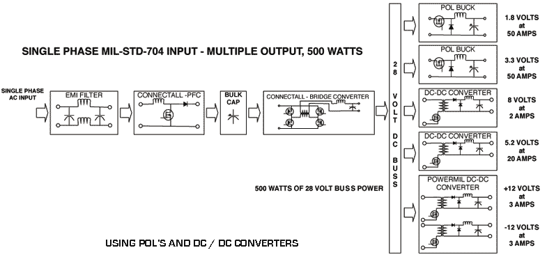 Not only does the Series provide the ideal interface between the military power busses and the customer’s input buss; but, it does it with extreme power efficiency. Consider the following typical application. A 3.3 Volt at 50 Amp output is needed from a single phase MIL-STD-1399 input. Using standard industry bricks and circuitry, an EMI filter would be mated with a 3.3V output DC-to-DC converter for a 99% x 75% = 74% efficient system. The same system requirements configured with the power system and a cascaded multiphase buck converter would create a 99% x 92% x 95% = 80% efficient system, at 17 less Watts of heat dissipated!